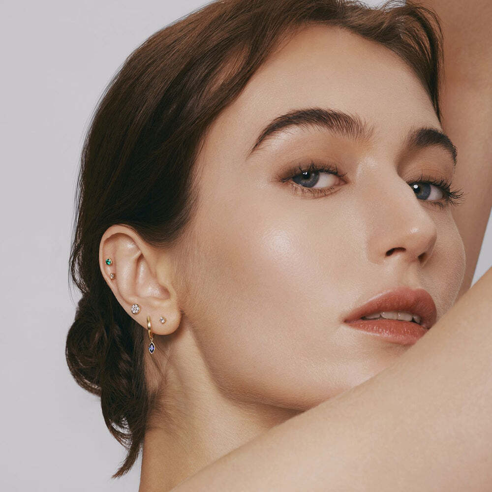 The Ciel dangle earring features a stunning marquise-shaped sapphire, gracefully dangling from a sleek gold flat huggie hoop. This elegant design offers a perfect combination of bold color and refined sophistication, ideal for elevating any look.