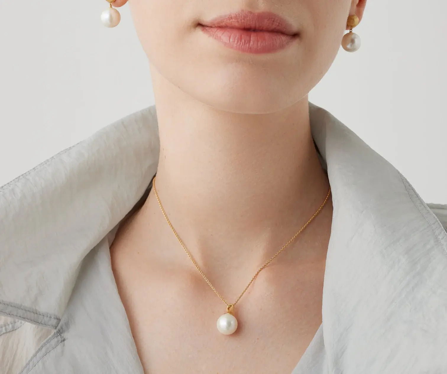 This 18K yellow gold and pearl pendant necklace is a timeless classic. The delicately elongated gold bail is hand-engraved using an ancient Florentine technique. The adjustable length provides the perfect fit and endless possibilities for any neckline, outfit, or occasion.