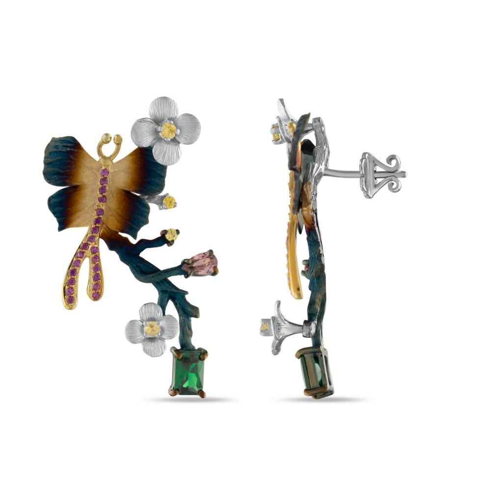 - 925 Global Warming Butterfly and Branch with Flowers Post Earrings with 2.6CT
