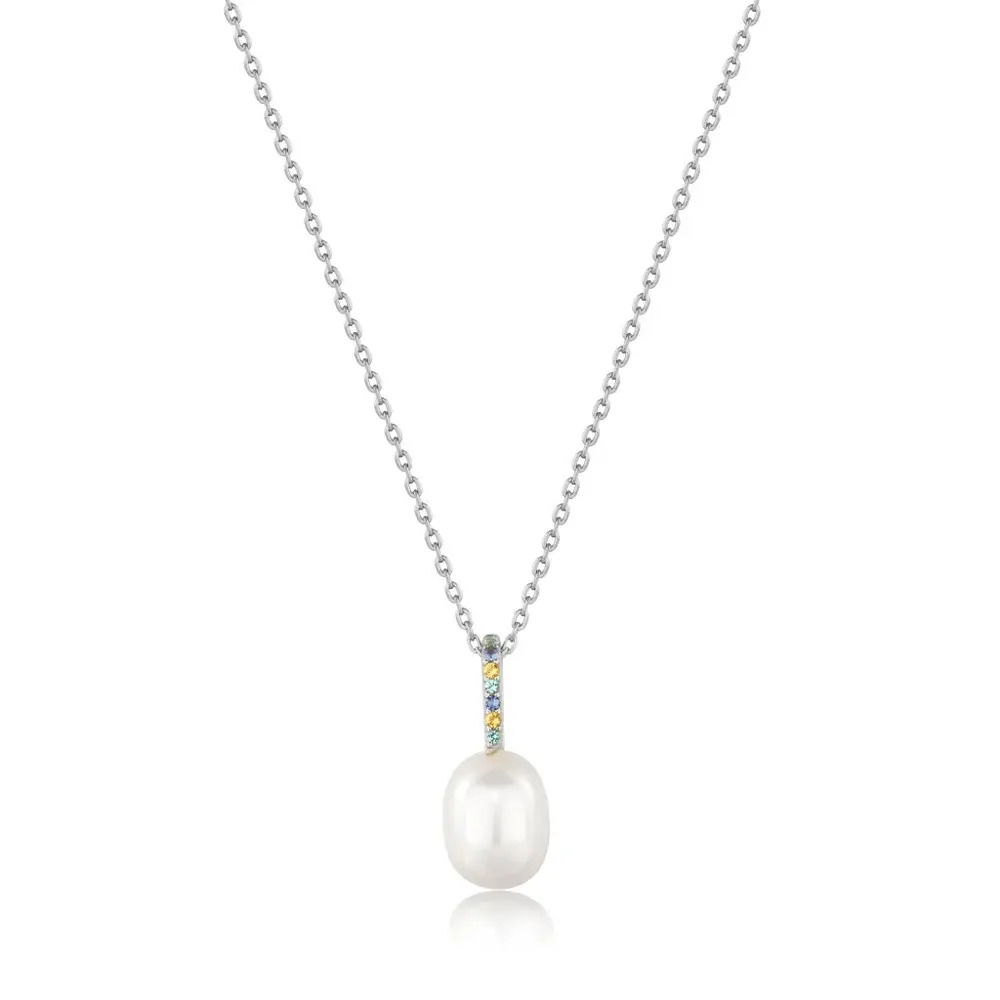 Add a statement pearl accent to your layered necklaces with this rhodium-plated sterling silver pendant, finished with a sprinkle of coloured sparkle. Set on a delicate silver chain, a real pearl pendant is styled with a rainbow of coloured nano gems. Pair this modern take on pearls with your favourite layering chains for a fresh take on a classic look.