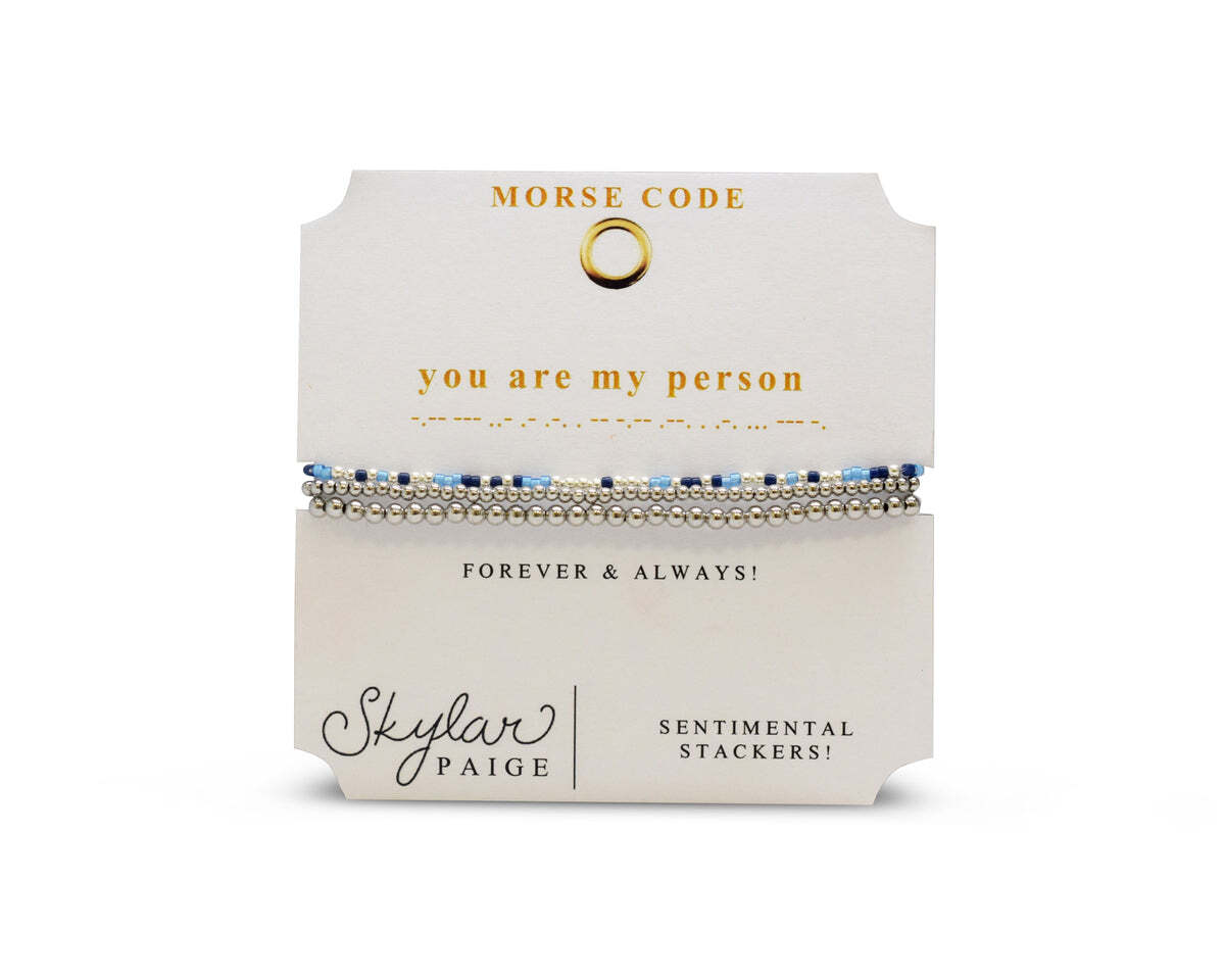 "Forever & Always" Morse Code Bead Pattern: YOU ARE MY PERSON Bracelet is packaged on inspirationally messaged card. STRETCH BRACELETS IN THE “NOTE TO SELF” COLLECTION ARE MADE FROM PREMIUM QUALITY, JAPANESE GLASS MIYUKI® TILA BEADS. THE BRACELETS ARE METICULOUSLY ASSEMBLED WITH A MORSE CODE PATTERN, INSPIRATIONAL