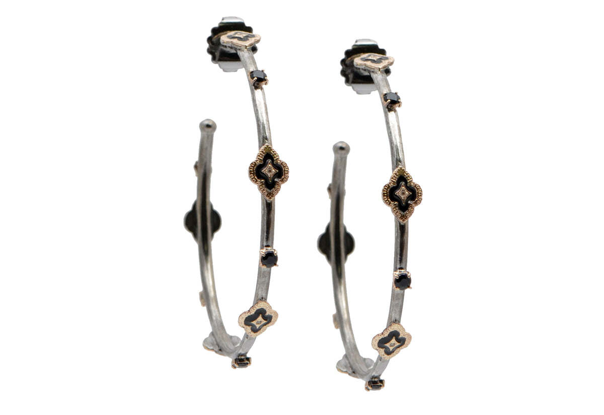 These elegant and stylish 14k rose gold and grey sterling silver hoop earrings are perfect for any occasion. The 52mm diameter hoops showcase black enamel textured scroll stations and black sapphires (0.04 TCW). Adding a subtle yet sophisticated touch to any look, these hoop earrings are sure to become your go-to accessories for any event.