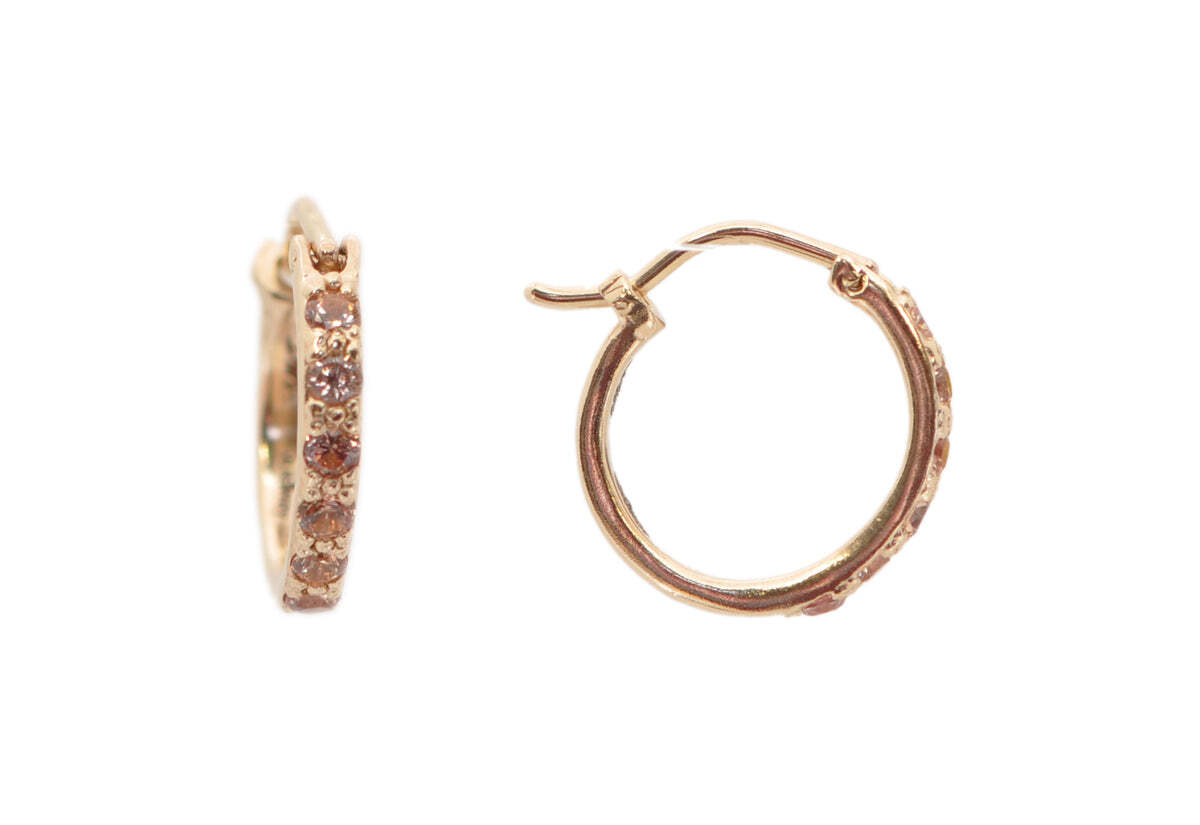 These stunning 14k rose gold huggie hoop earrings are the perfect way to add some sophisticated sparkle to your look. The 13mm design features 1.7mm yellow sapphires for a subtle hint of color and shine. With a total measurement of 13mm x 2mm, these earrings are the perfect addition to your favorite ensemble.