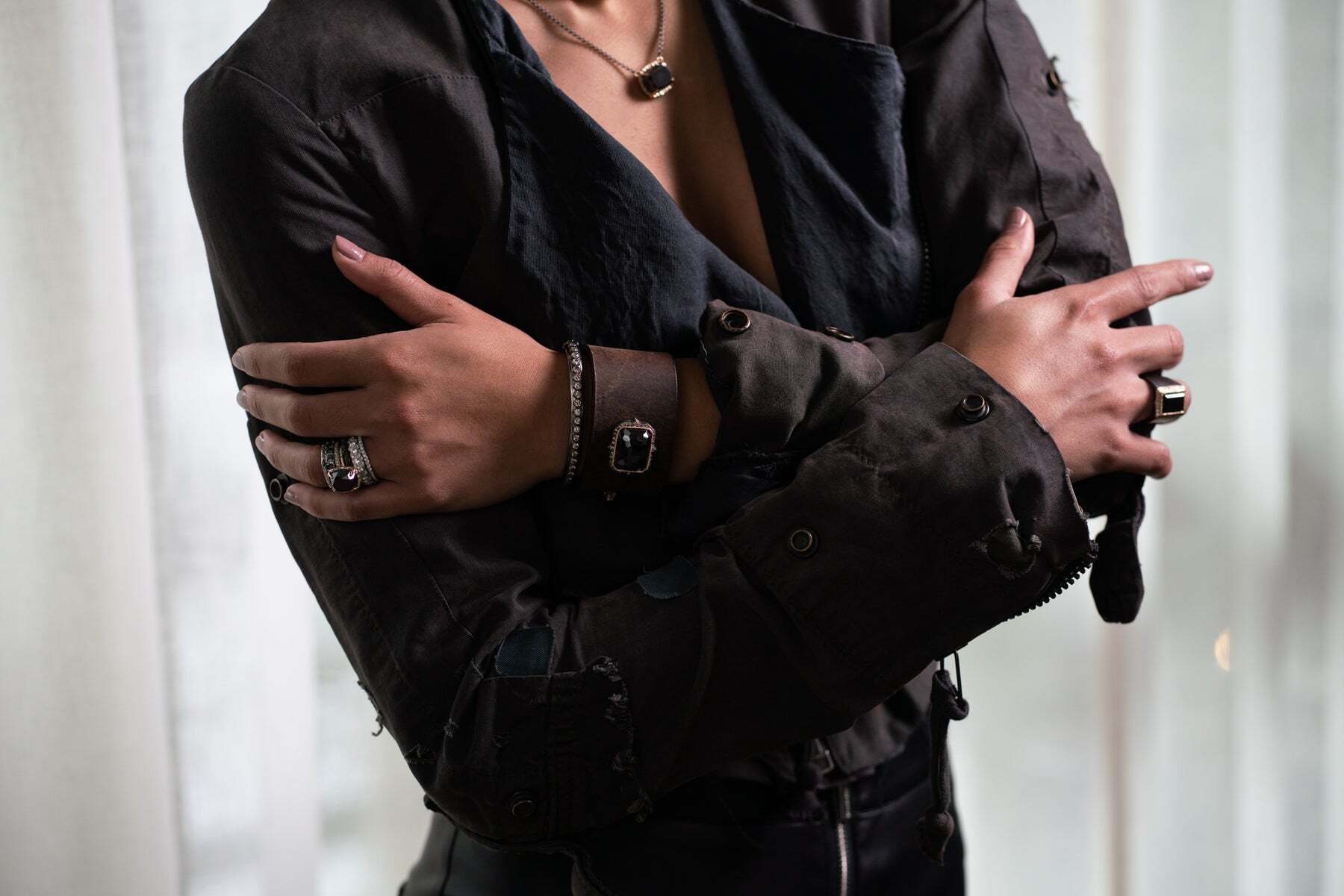 This stunning 14k rose gold and blackened sterling silver north south cocktail ring takes sophistication and elegance to the next level. Featuring a rectangle hematite at its center, the ring is accented with a pave border and dazzling champagne diamonds for a truly unique look. Wear this piece to elevate any ensemble and make a fashion statement that will never go unnoticed.