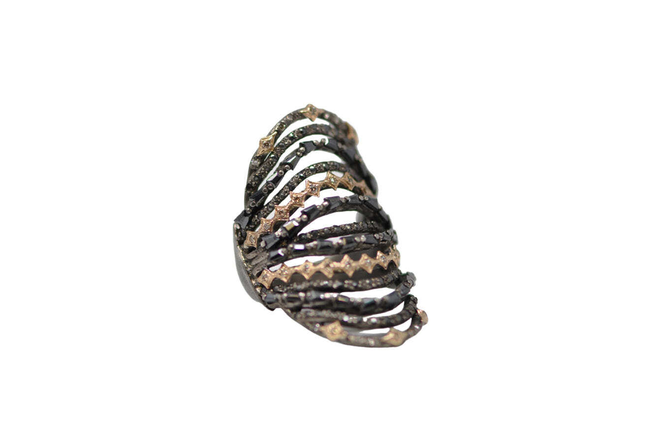 This beautiful piece of jewelry is the perfect addition to any collection. Crafted with a captivating combination of 14k rose gold and sterling silver, it features multiple bands of hematite tapered baguettes, round hematites, and champagne diamonds. This multi-banded ring will make a stunning statement with any ensemble. Its fashionable style and timeless design make it the perfect accessory for any occasion. Wear it alone for a graceful, minimal look, or pair it with other pieces for a bolder statement. No matter how you wear it, you are sure to make an unforgettable impression with this 14k Rose Gold and Grey Sterling Silver Multi-banded Ring.