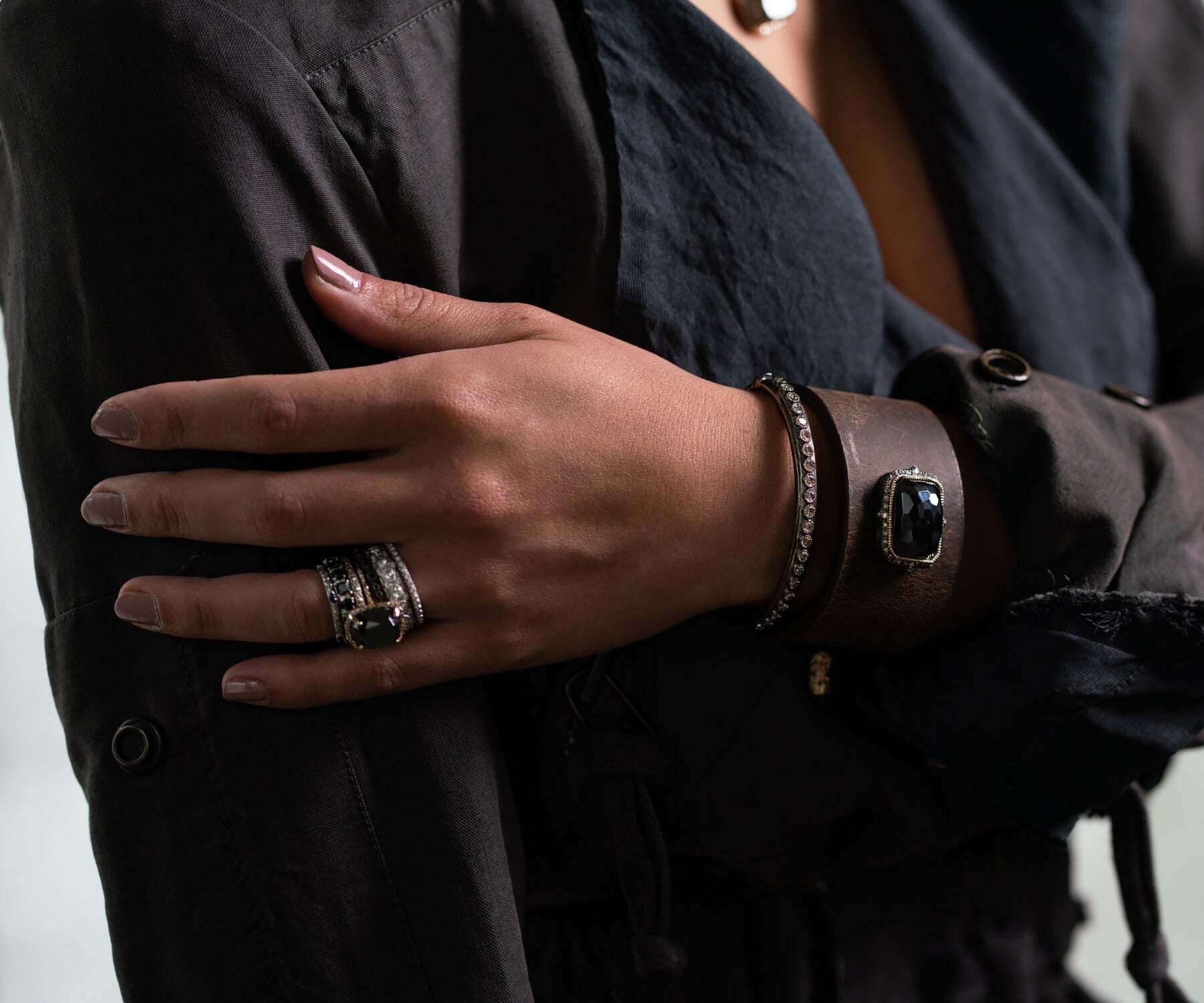 This stunning ring is crafted from 14k rose gold and showcases a half eternity band of champagne diamonds. At the centre of the piece is a magnificent hematite gemstone, which is framed by the extravagant diamonds for extra sparkle and luxury. Perfect as an engagement or special occasion gift, this piece is a timeless and classic symbol that will never go out of style.