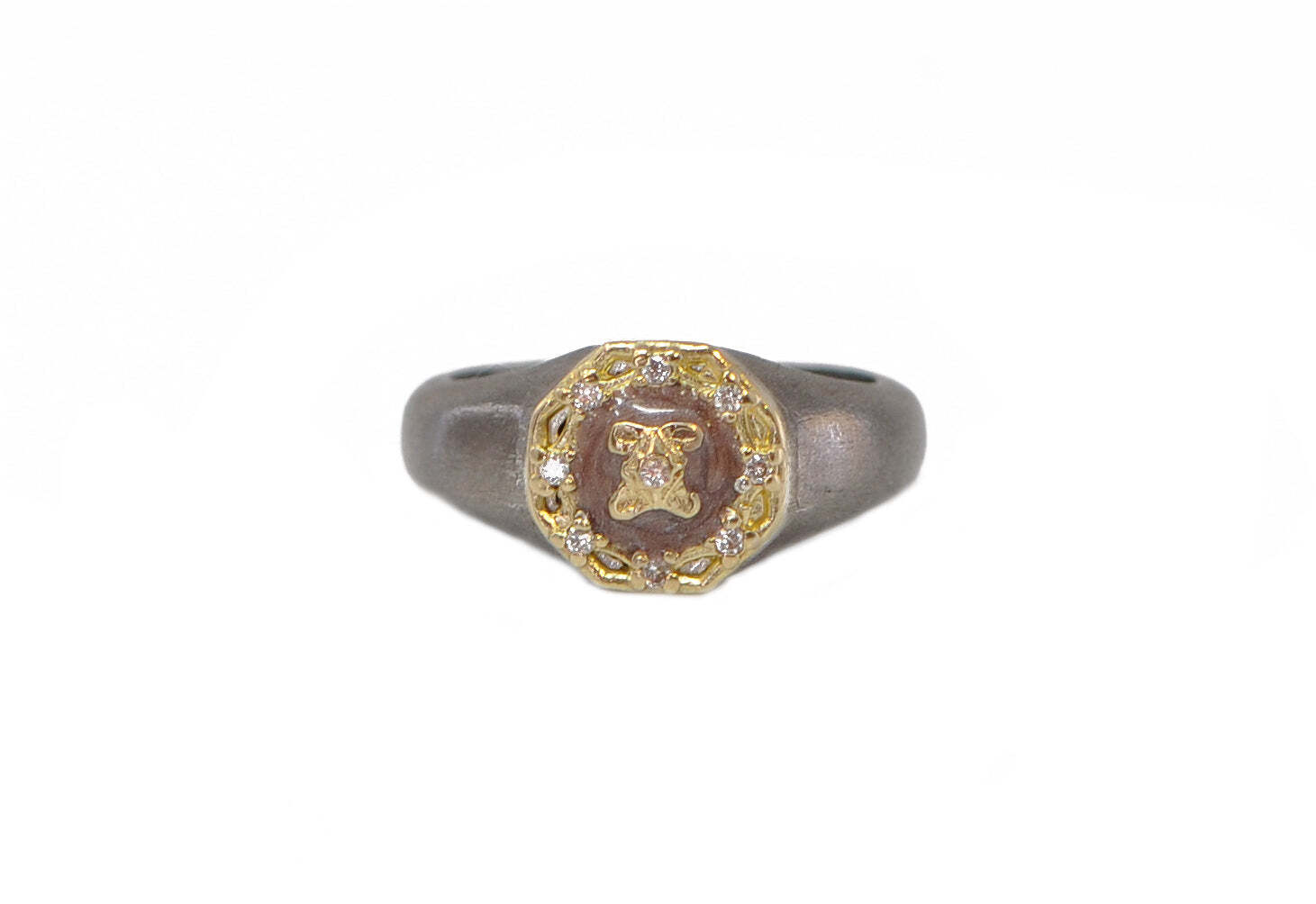 This stunning 18k yellow and grey sterling silver ring is a perfect combination of modern sophistication and classic elegance. The moody mauve enamel adds a unique flair and is highlighted with 0.04 CT white diamonds for an extra sparkle. This timeless piece is perfect for any occasion, from special occasions to casual everyday wear. Crafted with the utmost care and attention to detail, this gorgeous ring is sure to become a treasured favorite.