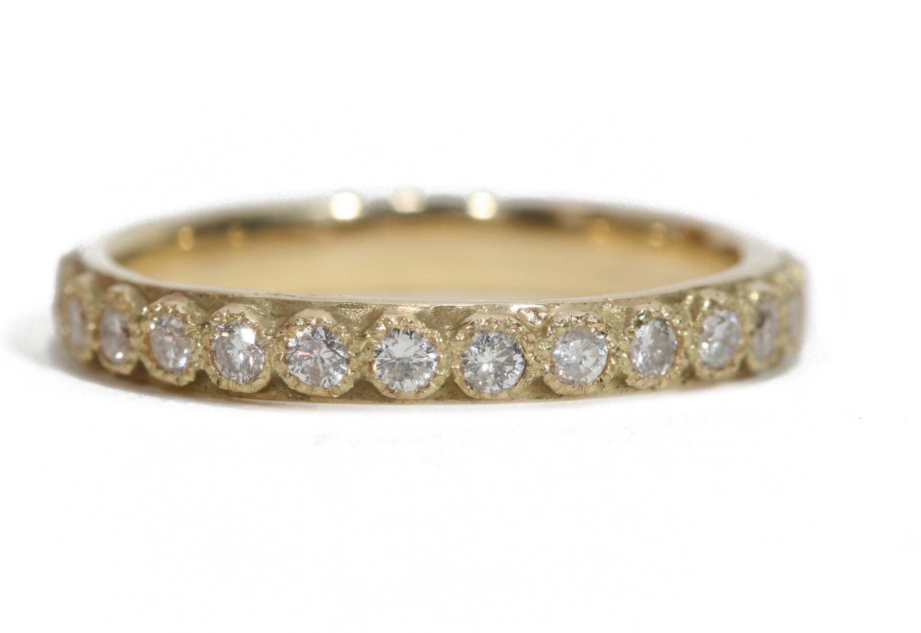 This beautiful 18K yellow gold stack ring adds a hint of sparkle to any look with its 0.68 TCW of round brilliant-cut white diamonds. The perfect way to add a touch of elegance to your outfit, this gorgeous ring features a band width of 0.11 inches (2.94mm) and is a must-have accessory for any jewelry collection. Show off your unique style with this stunning yellow gold stack ring and diamond accents.