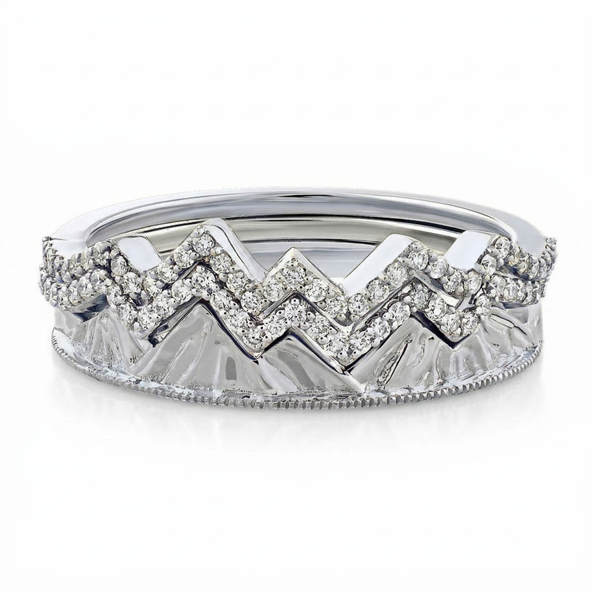 - 14KW White Gold Ring Mountain Range Alternating Pave & Polished Diamond 0.21 Ctw