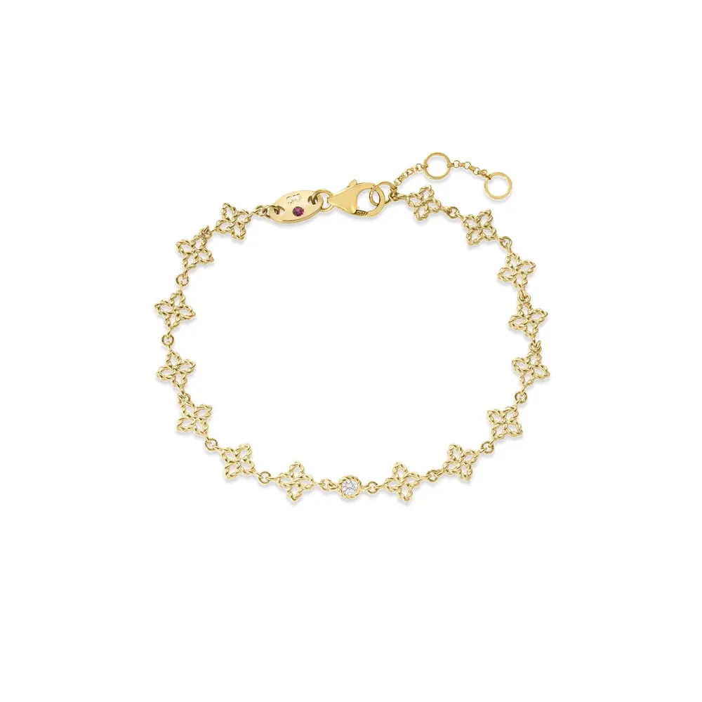 Delicate and refined, this bracelet showcases a series of Principessa floral motifs and a centered diamond accent. It offers a graceful fit and subtle sparkle, perfect for layering or wearing alone. This piece embodies the timeless Italian craftsmanship and elegance that define Roberto Coin.