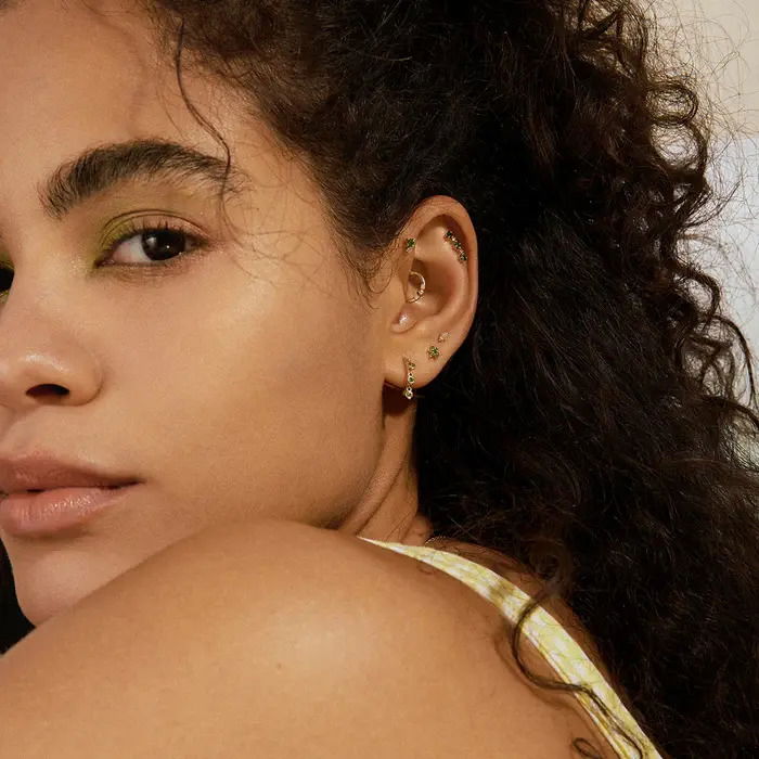 A bright green tsavorite shines in this triangular threadless piercing design. This dainty pyramid looks great in practicially any ear placement.
