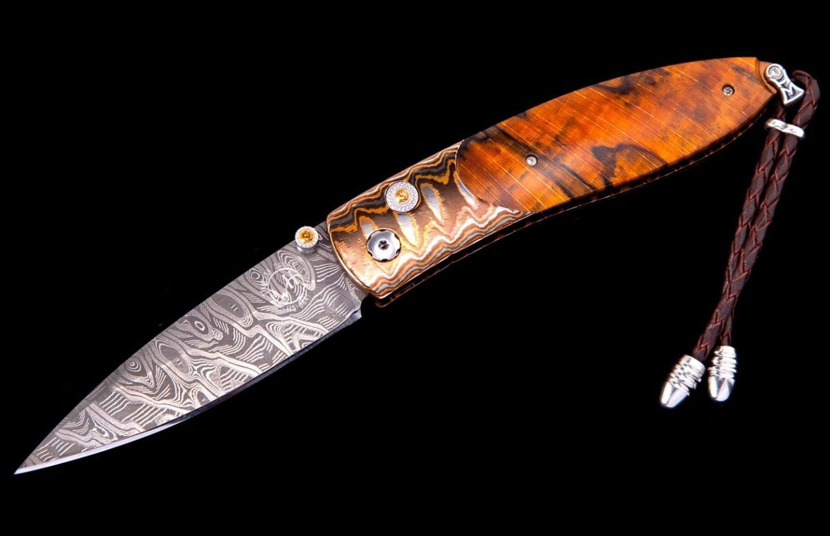 This Monarch 'Autumn' features a handle in 'Wave' mokume gane, inlaid with orange spalted beech wood. The blade is hand-forged 'Hornets Nest' damascus steel by Mike Norris; the one-hand button lock and the thumb stud are set with citrine gemstones.