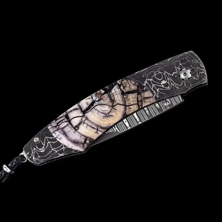 The Spearpoint 'Adventure II' features a beautifully unique frame in hand-forged, etched 'T-Rex' damascus by Delbert Ealy, a leading damascus artist. This frame has been inlaid with incredible 10,000 year-old fossil Woolly Mammoth tusk scales, and the bla