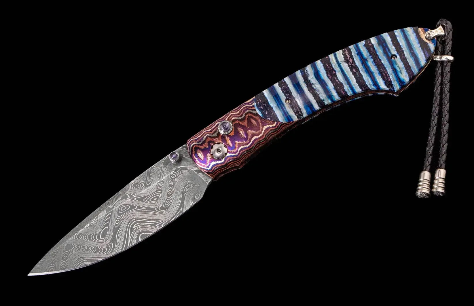 The Spearpoint 'Impact' features a beautiful frame in William Henry's signature (and patent pending) 'Wave' Mokume, inlaid with 10,000 year-old fossil Woolly Mammoth tooth. The blade is hand-forged 'Boomerang' damascus by Chad Nichols. The one-hand button lock and the thumb stud are set with iolite gemstones. A remarkable design that gives you an instrument with a full-size secure grip, and a versatile deep-belly blade, the Spearpoint epitomizes William Henry’s core philosophy – that superlative function deserves to be elevated to superlative art. The 'Impact' also features 2 of William Henry's most admired and distinctive forged metals; a timeless heirloom to be proudly worn and used for a lifetime before being handed-down to another generation.