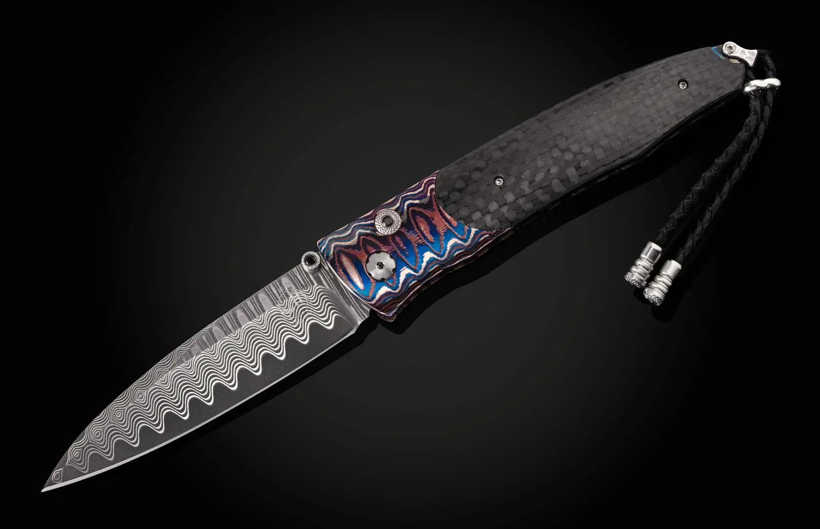 The Gentac ‘Azure Sky' features a stunning and unique frame in a heat-colored iteration of William Henry's signature 'Wave' mokume gane. This frame has been inlaid with carbon fiber scales, and the blade is crafted from 'Wave' damascus with an extra strong core in VG-10. The one-hand button lock and the thumb stud are set with spinel gemstones. An exceptional design that offers rigorous performance in a sleek, comfortable knife, the Gentac is also the perfect canvas to showcase William Henry’s range of exotic materials and techniques. The ‘Azure Sky’ features some of the exotic materials and hand-forged metals that are the hallmark of William Henry's collections; a timeless heirloom to be proudly worn and used for a lifetime before being handed-down to another generation.