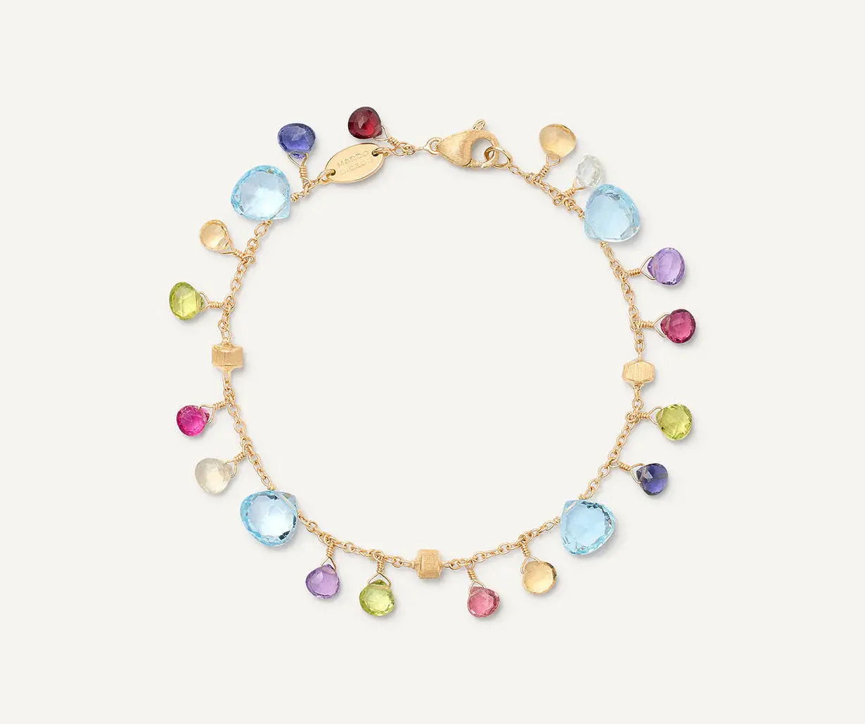 Light and cheerful, this multi-strand bracelet is perfect worn alone or matched with other Marco Bicego jewels. It features select heart-cut sky topazes, in an extraordinary explosion of color. The 18K yellow gold nuggets are finely hand-engraved using an ancient Florentine technique.
