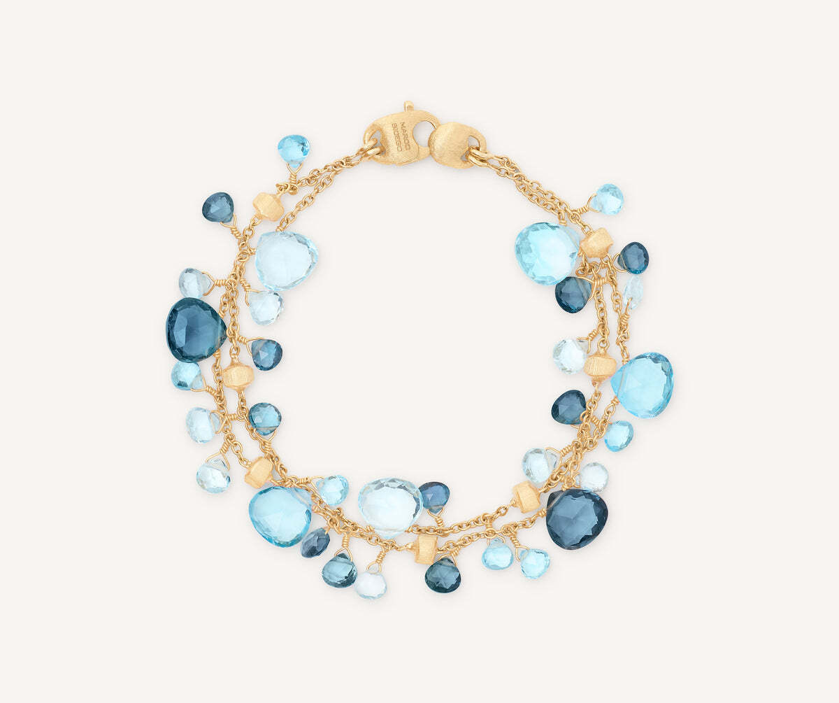 Light and cheerful, this double-strand bracelet is perfect worn alone or matched with other Marco Bicego jewels. It features selected heart-cut topazes in various shades of blue, ranging from a delicate light blue reminiscent of the sky to deeper and more intense blues. The 18K yellow gold nuggets are finely hand-engraved using the ancient Florentine technique.
