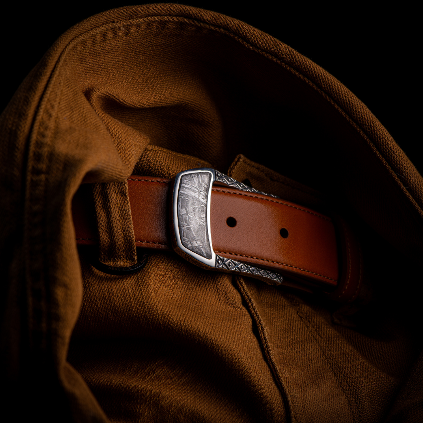 This beautiful belt buckle works from the street to the boardroom, and it creates an elegant accent to any attire. Sculpted in solid sterling silver, the highlight is a timeless inlay of authentic Gibeon Meteorite. Showcasing a unique crystalline micro-s