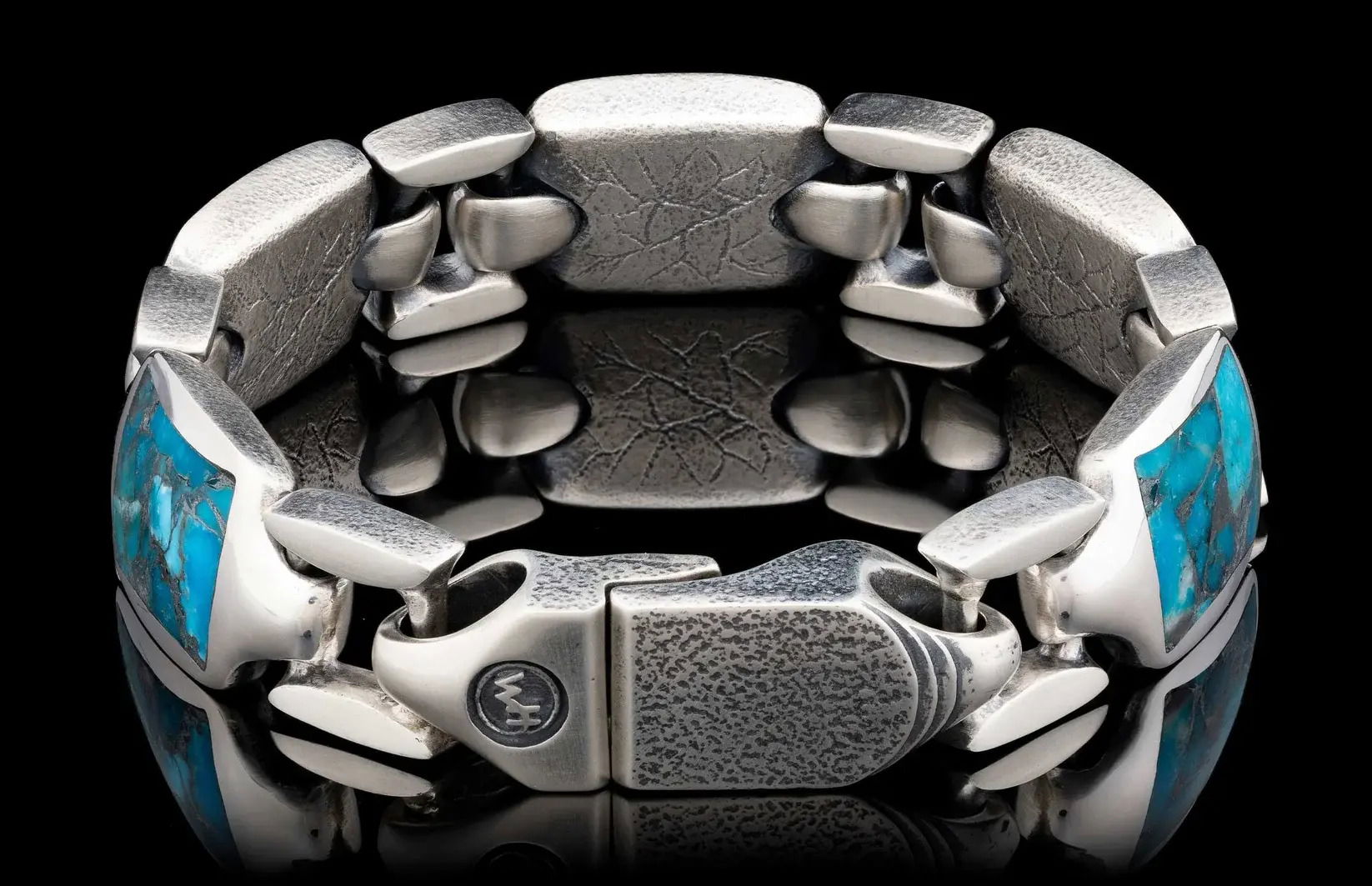 The 'Turquoise Retro’' features heavy sculpted sterling silver links inlaid with zinc infused Kingman Turquoise. This stunning material displays a beautiful contrast between the soft blues of the Turquoise and the contemporary sharpness of the zinc. In addition to precise hand finishing, it features our interlocking sterling silver snap clasp.
