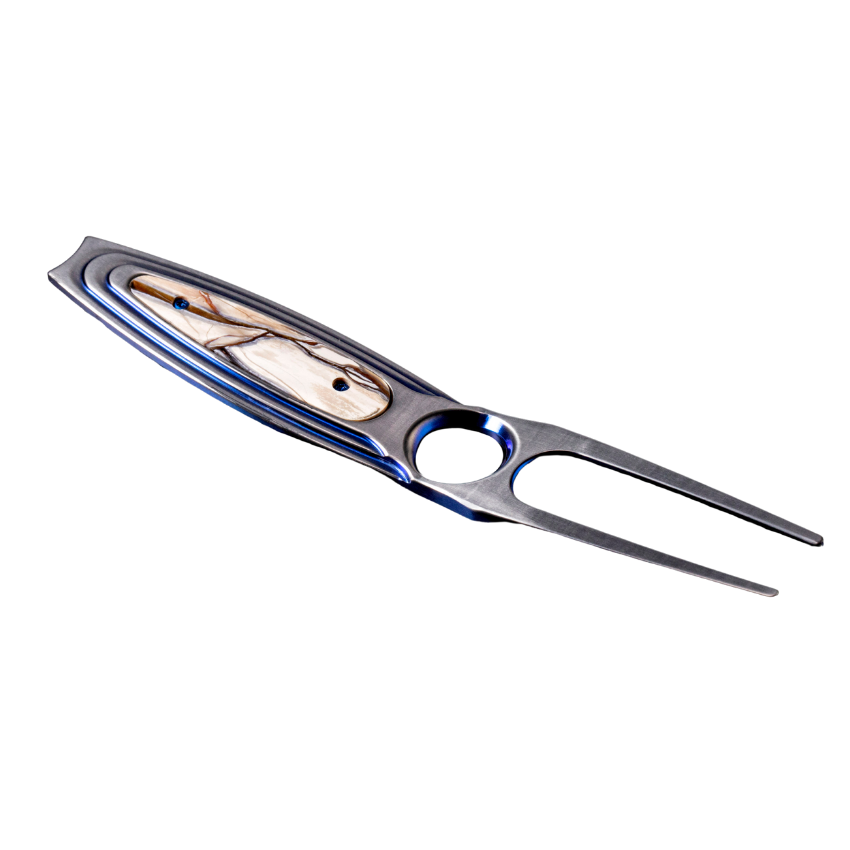 Up your game! Or at least your style while out on the links with this gorgeous divot tool from William Henry. The 'Eagle' features a solid body machined from aerospace grade titanium billet and hand-polished to a beautiful satin luster. The oversized chamfered hole gives your thumb a great resting point for control during use (and it looks cool, too). Featuring a mirror polished inlay of fossil Woolly Mammoth tusk, and set with blue anodized titanium screws. Finishing touches include selective blue anodizing on the titanium body, and our classic ClipCase for easy and safe carry. Designed and executed for a few hundred years of service...