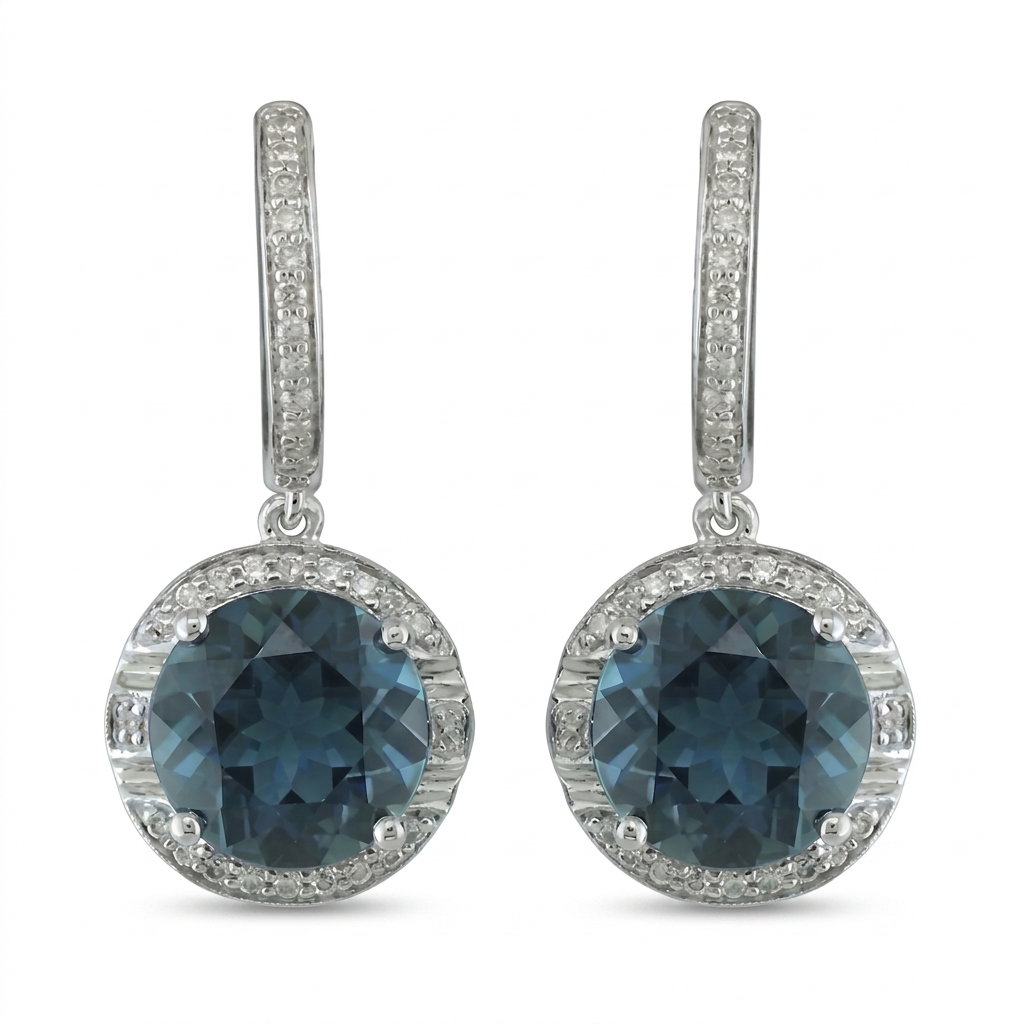 - 14K White Gold 6.21ct London Blue Topaz with .28ct Diamond Halo Drop Earring