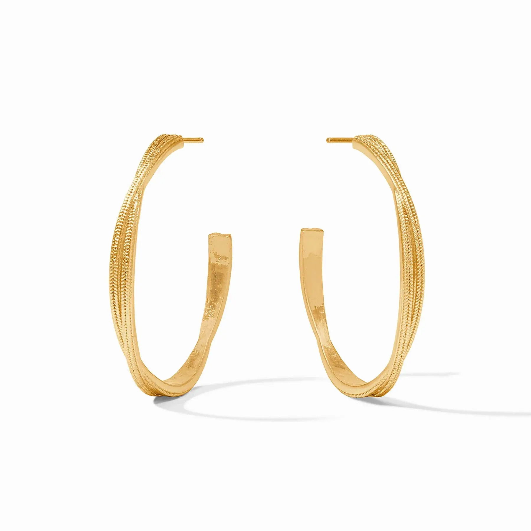 Each earring is formed from two twisting, interlocked hoops textured with braided golden wire.