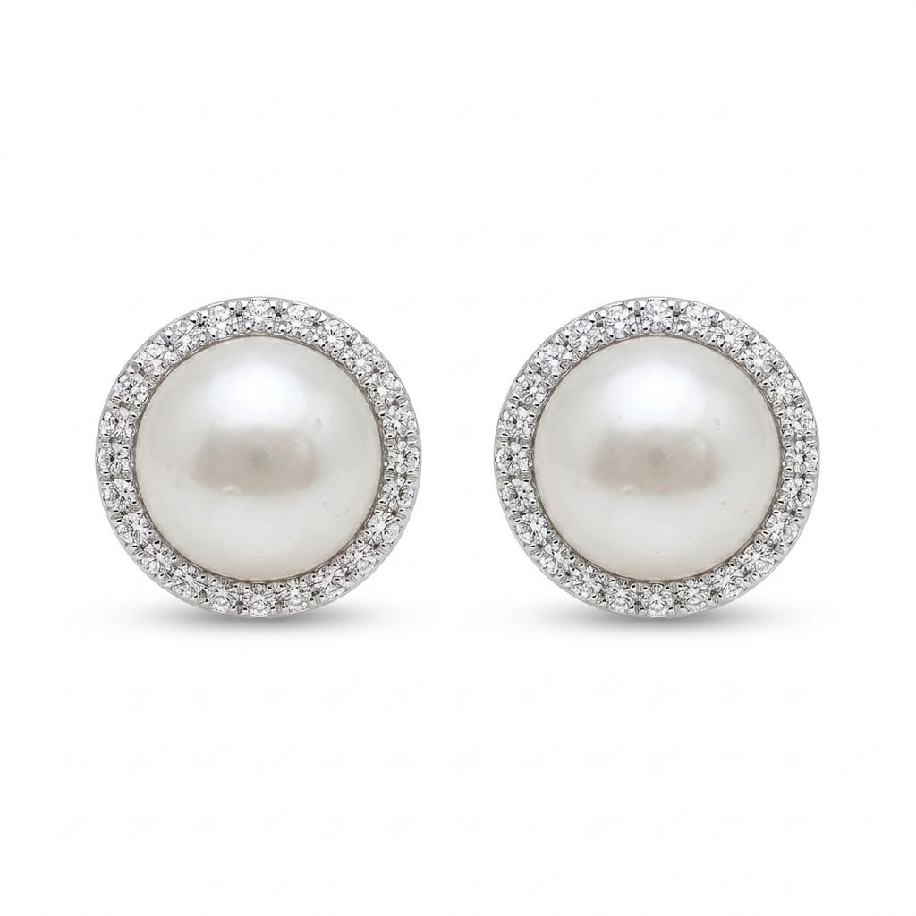 - 14k White Gold 6mm Fresh Water Pearls and .10ct Diamond Studs