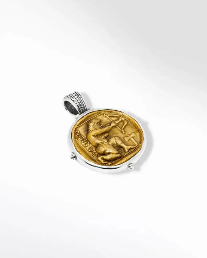 254467 - HERCULESKonstantino men's hand-etched two-sided Hercules pendant.Sterling silver and bronze.Approx. 1 1/4" diam.Handmade in Greece.