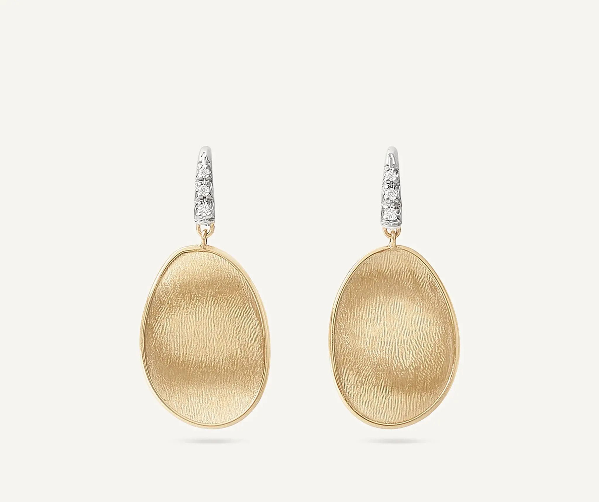 Handcrafted in Italy, these small petal drop earrings from the Lunaria collection feature 18K yellow gold, finely hand engraved using the ancient Florentine technique. The diamond-studded earrings showcase a unique design, combining the warmth of yellow gold with the brilliance of diamonds, creating a sophisticated and timeless accessory.