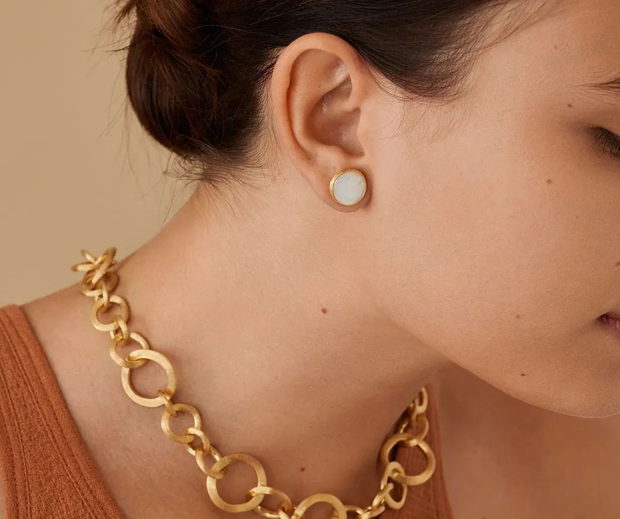 Pop-colored and minimalist, these rose-cut semi-precious gemstone stud earrings are embellished by an 18K yellow gold bezel set Mother of Pearl, finely hand-engraved using the ancient Florentine technique.