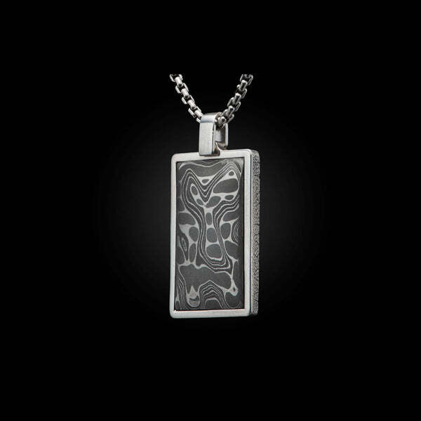 The Damascus Pinnacle pendant - Metal on metal, in a bold yet understated contrast. Featuring inlaid hand-forged 'Intrepid' damascus by Chad Nichols, set into an elegant sterling silver pendant presented on an antique finish sterling silver chain. Engraving space on the back to make a timeless statement.