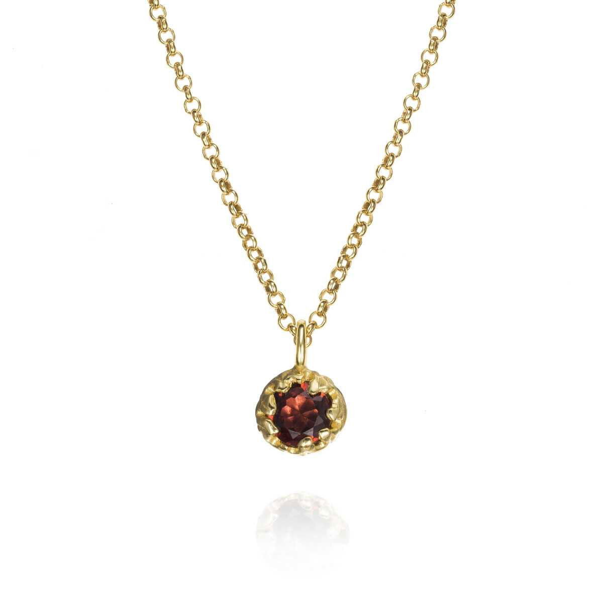 Pendant with natural Garnet stone from the BLOOM – Birthstone collection. Designed by Jorge Revilla in sterling silver 925 with 18k gold vermeil. Chain sold separately. Symbol of passion and vitality, birthstone of January.Sterling Silver 92518k Gold VermeilNatural stone: GarnetLength 12 mm