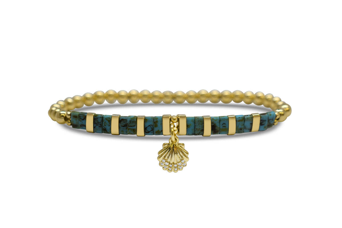 "Like a seashell, beautiful & unique." Enamel Charm: SHELL Bracelet is packaged on inspirationally messaged card. STRETCH BRACELETS IN THE “SO CHARMING” COLLECTION ARE MADE FROM PREMIUM QUALITY, JAPANESE GLASS MIYUKI® TILA BEADS. THE BRACELETS ARE METICULOUSLY ASSEMBLED WITH A MORSE CODE PATTERN, INSPIRATIONAL MESS